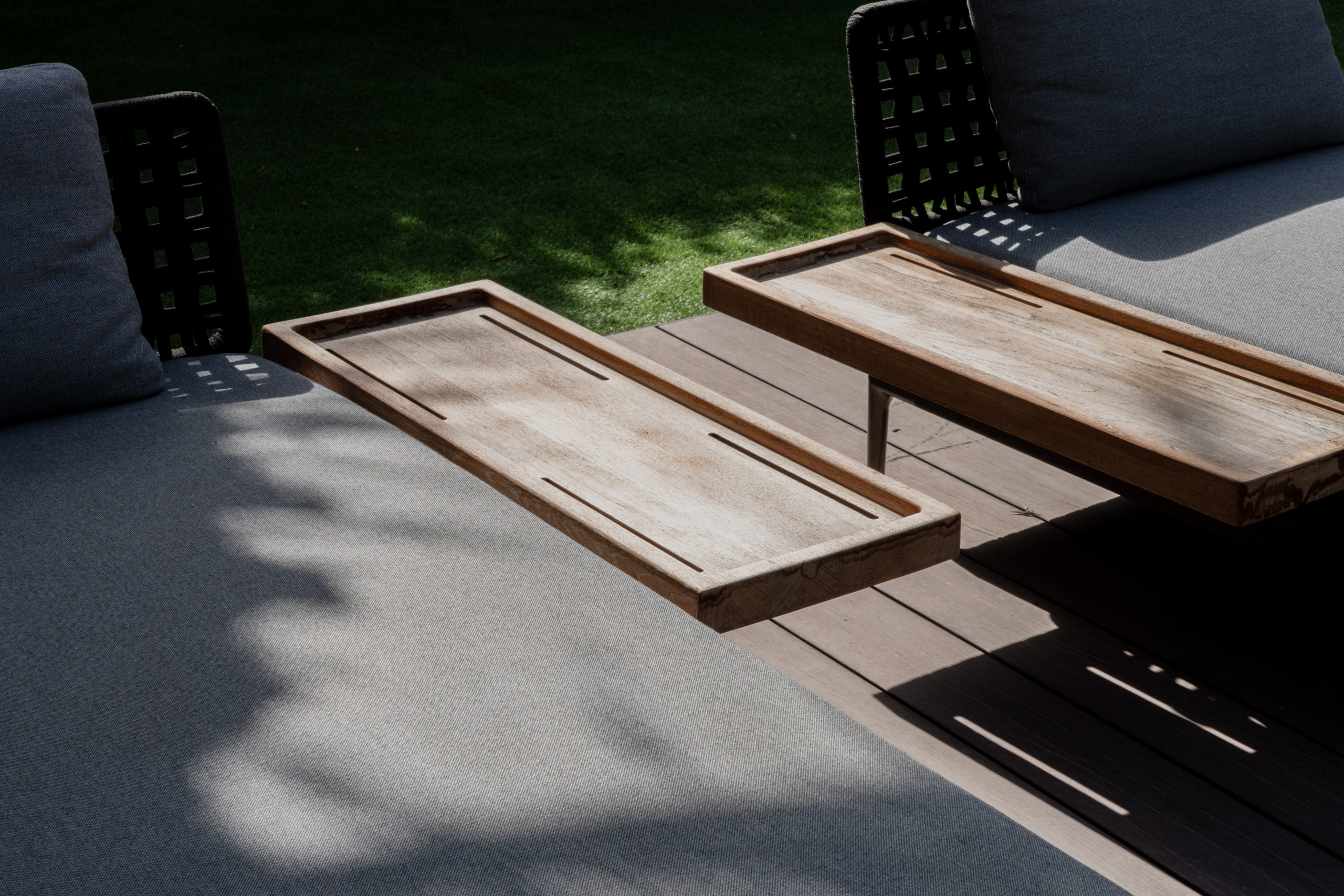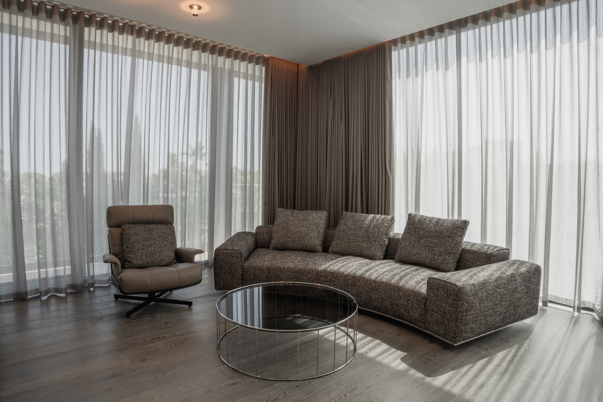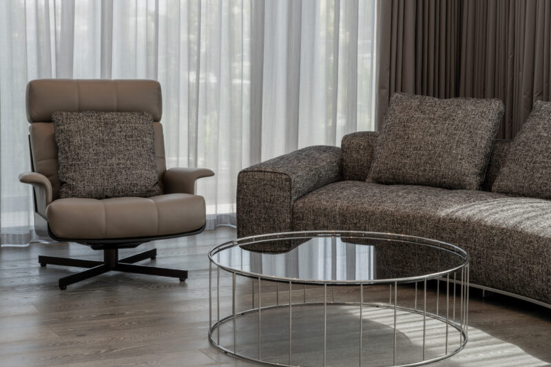 The Villa itself has an impressive entrance and that is mostly used for greeting guest. There is the advantage of having separate living quarters that could be designed differently. While still choosing beautiful pieces in the living quarters we proposed more functional pieces with the intention that these would be used more often.