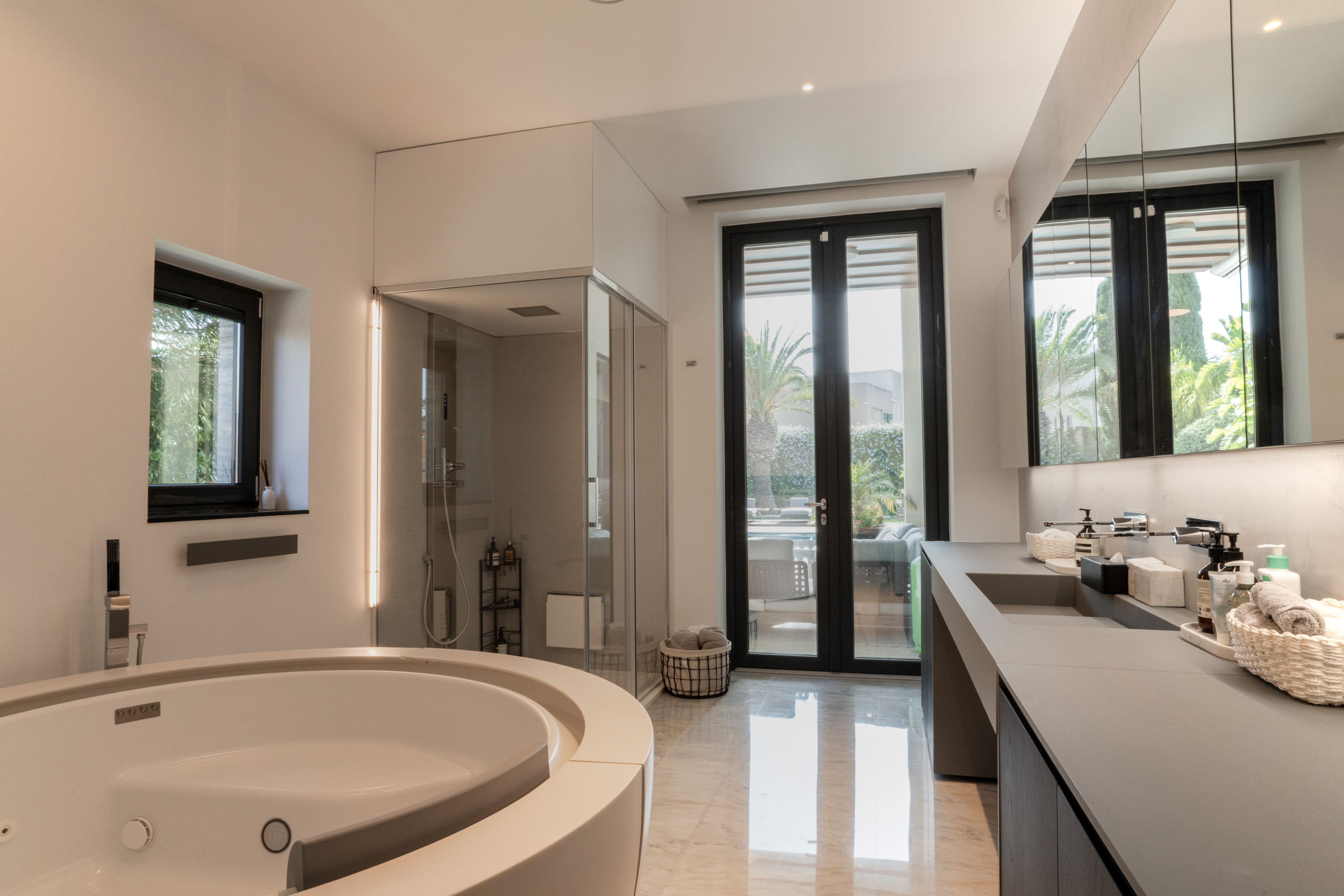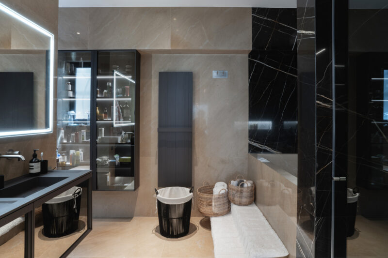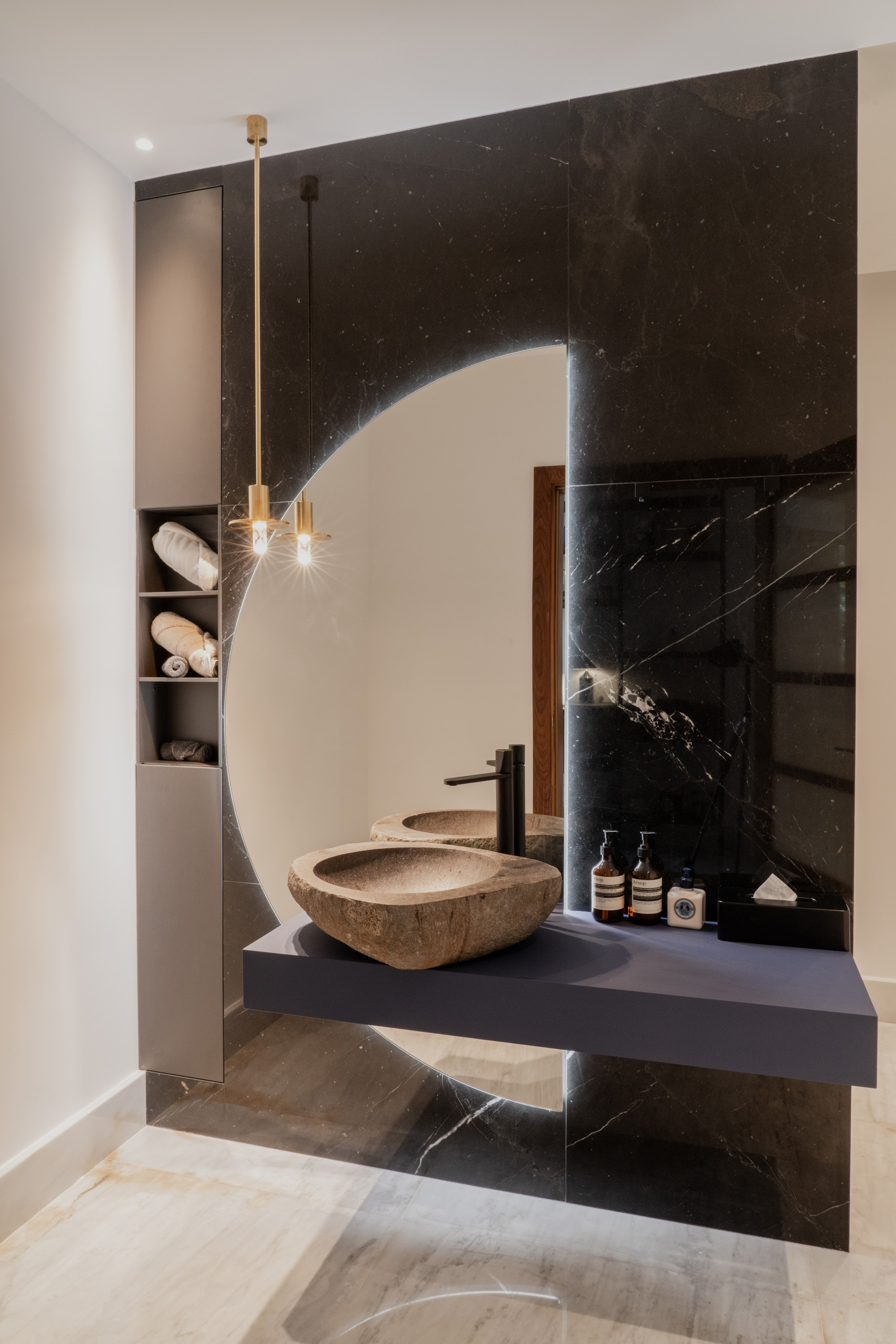 Every aspect is personalised, from the marble flooring to the lighting. Every element was chosen with the client and mirroring the family’s aesthetic. Bathrooms were completly custom made with a marble jacuzzi made specifically for the space. Marble slabs were chosen for each room and we worked closely with the contractors to design a beautiful finished product.