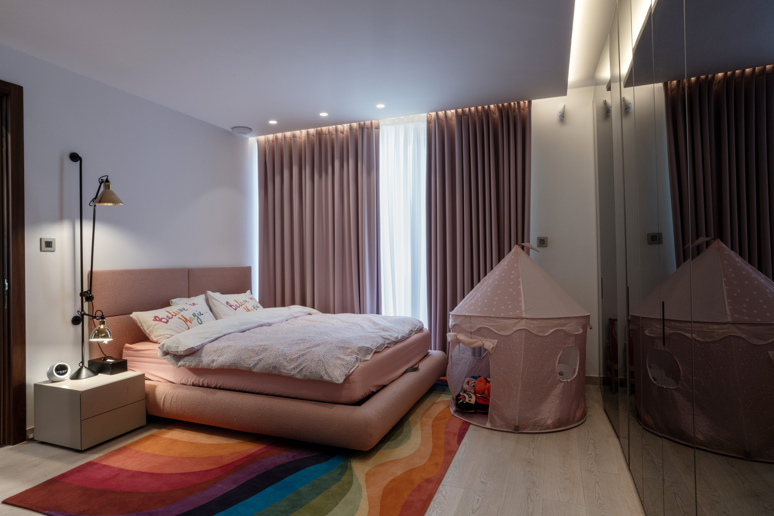 Bathrooms, doors, beds, carpets and curtains were custom made for the space.
