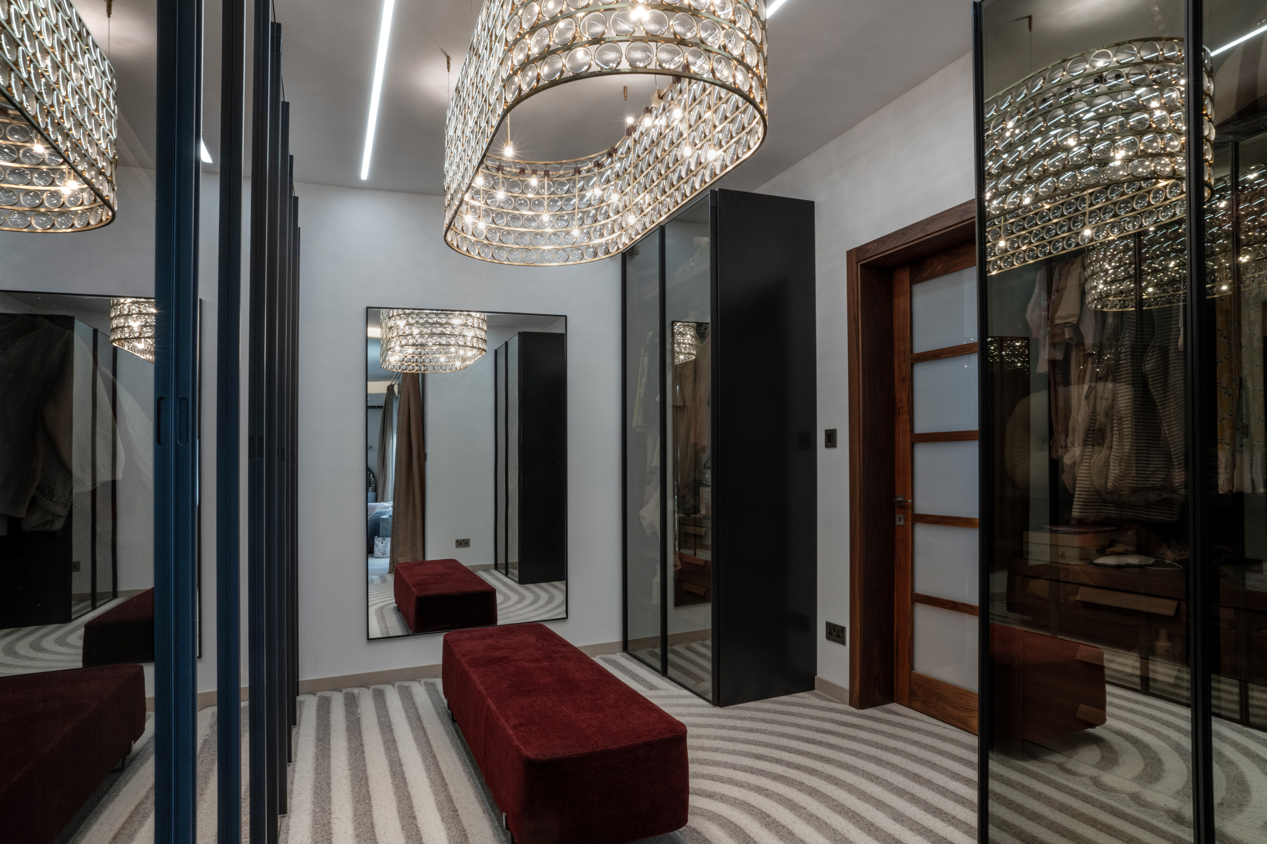 Large carpets to mirror the large rooms and space. A beautiful chandelier designed for Valentino in the walk in wardrobe. Most of the decorative lighting pieces. Fully accessorised wardobes with LED lighting and leather detail.