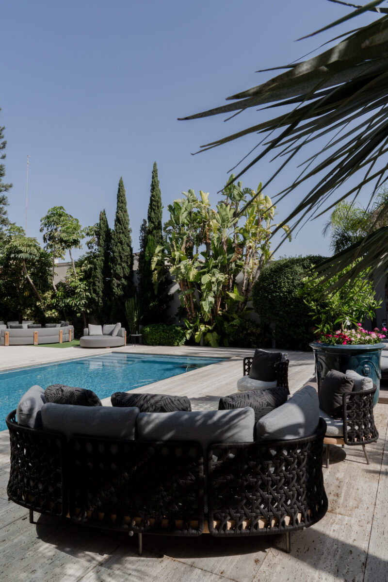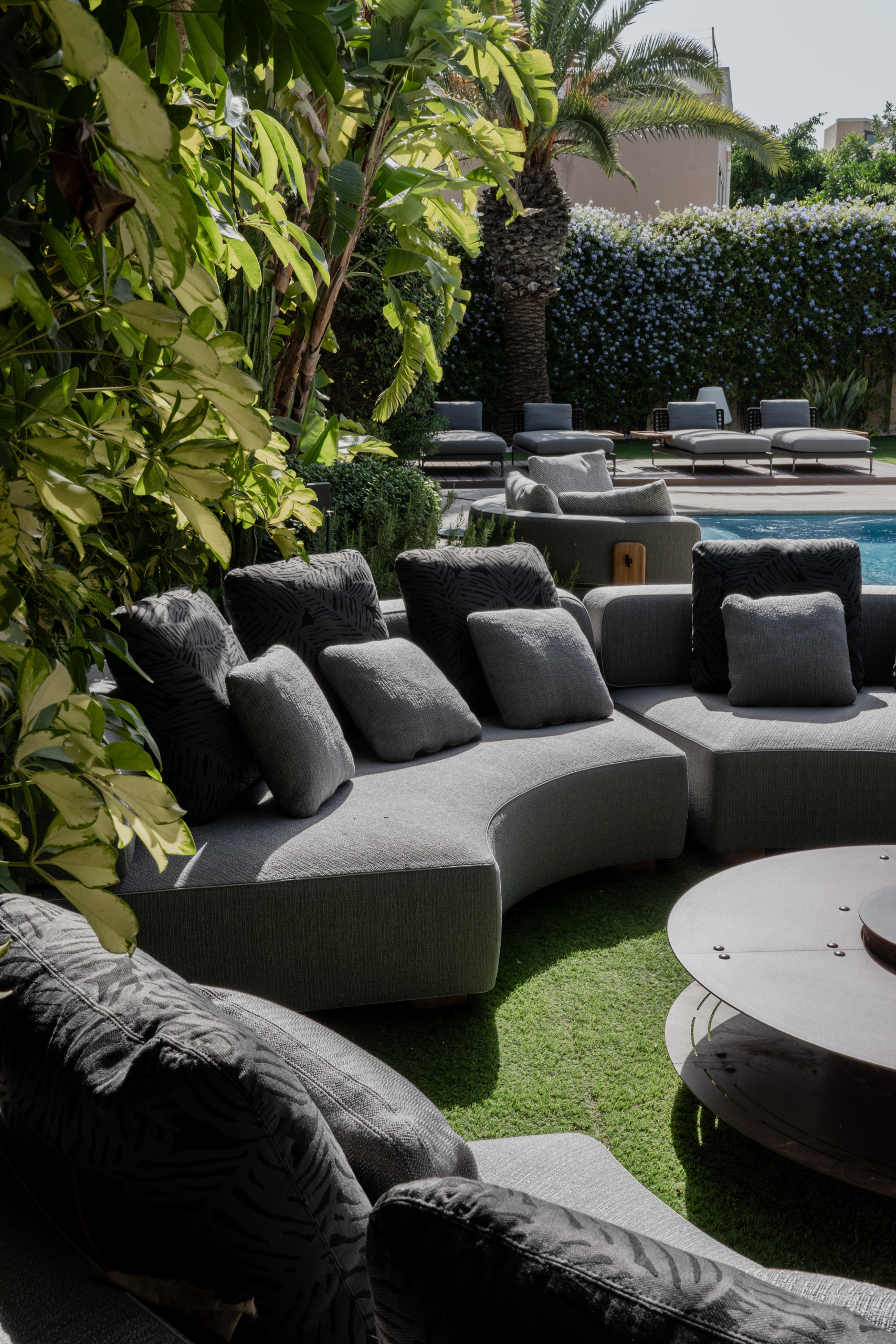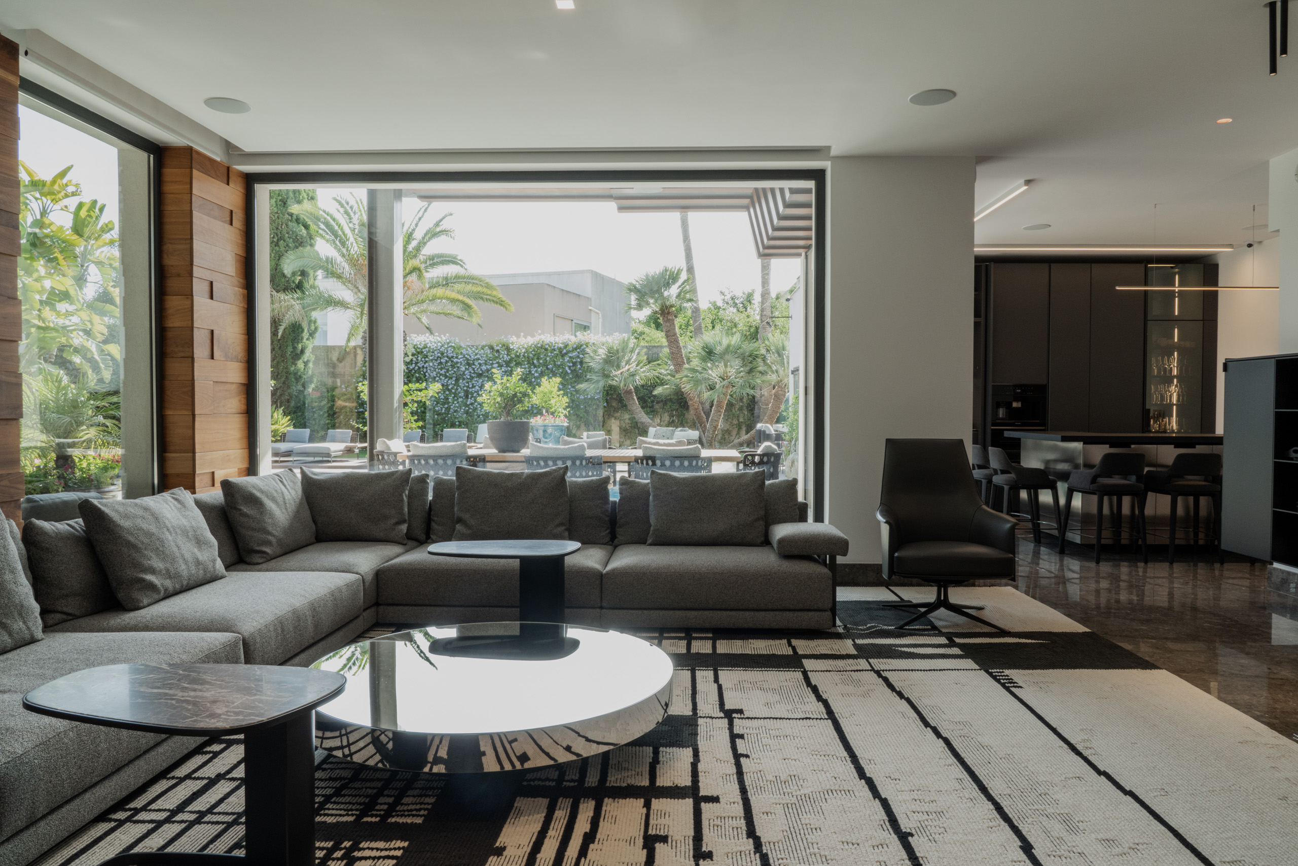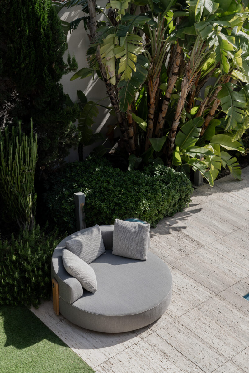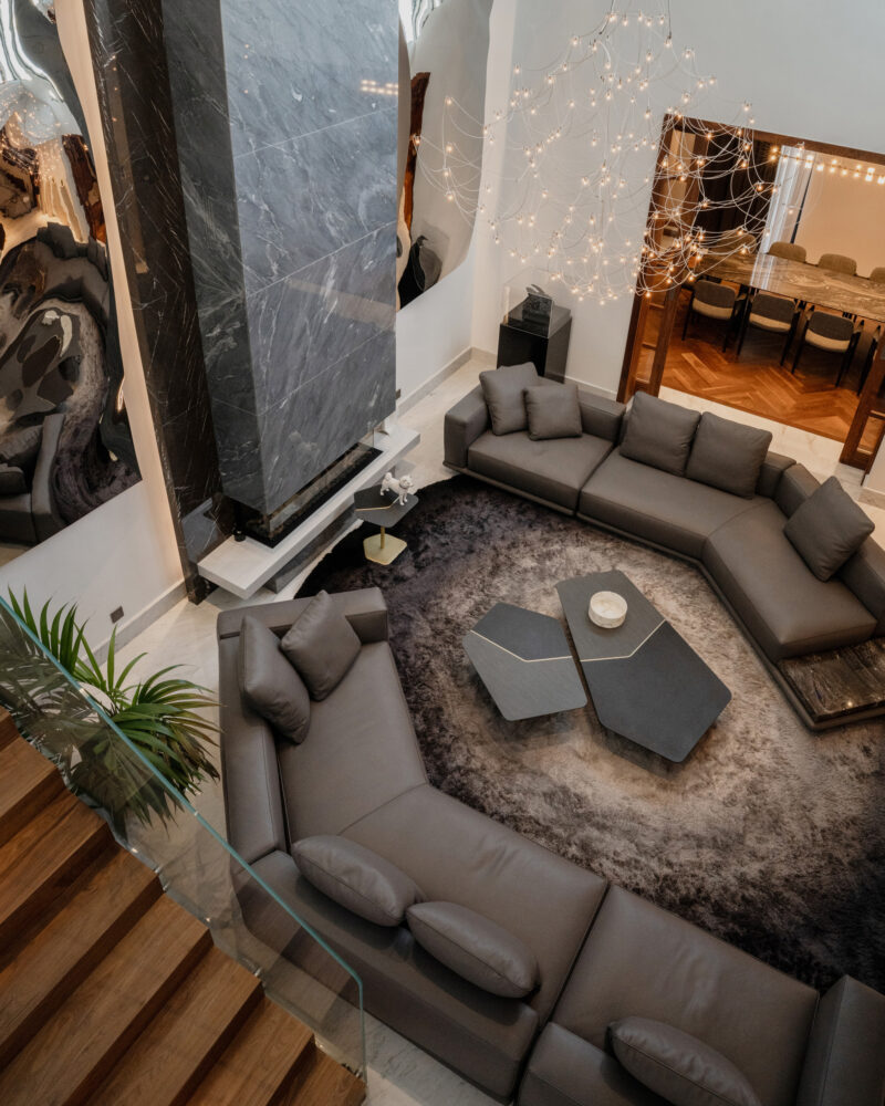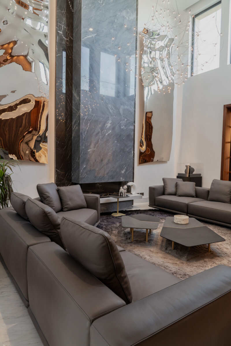 The entrance space and the look achieved with the gorgeous Minotti leather sofas and marble tables partnered with Kane Cali’s pieces hanging on the sides of the majestic marble fireplace. The outdoor area is also one of a kind with three separate areas that may be enjoyed with family and friends: Dining area, sun louging area, and sofa area with a metal firepit in a corten finish.