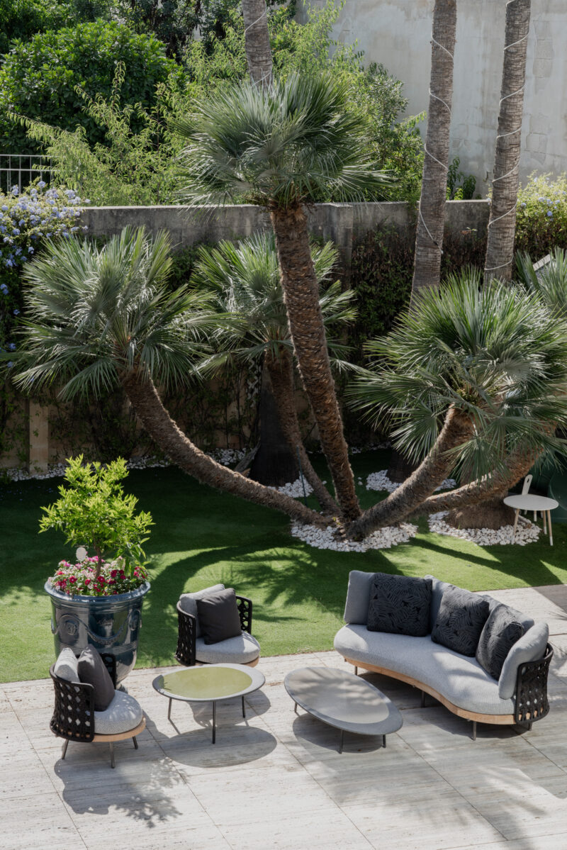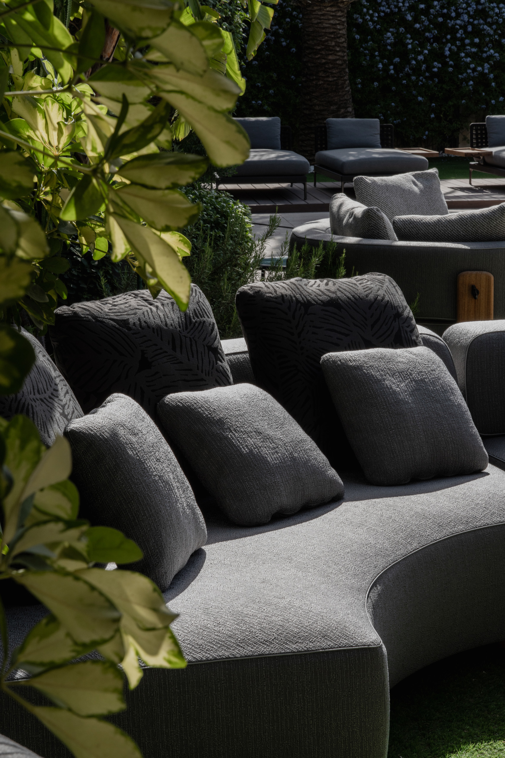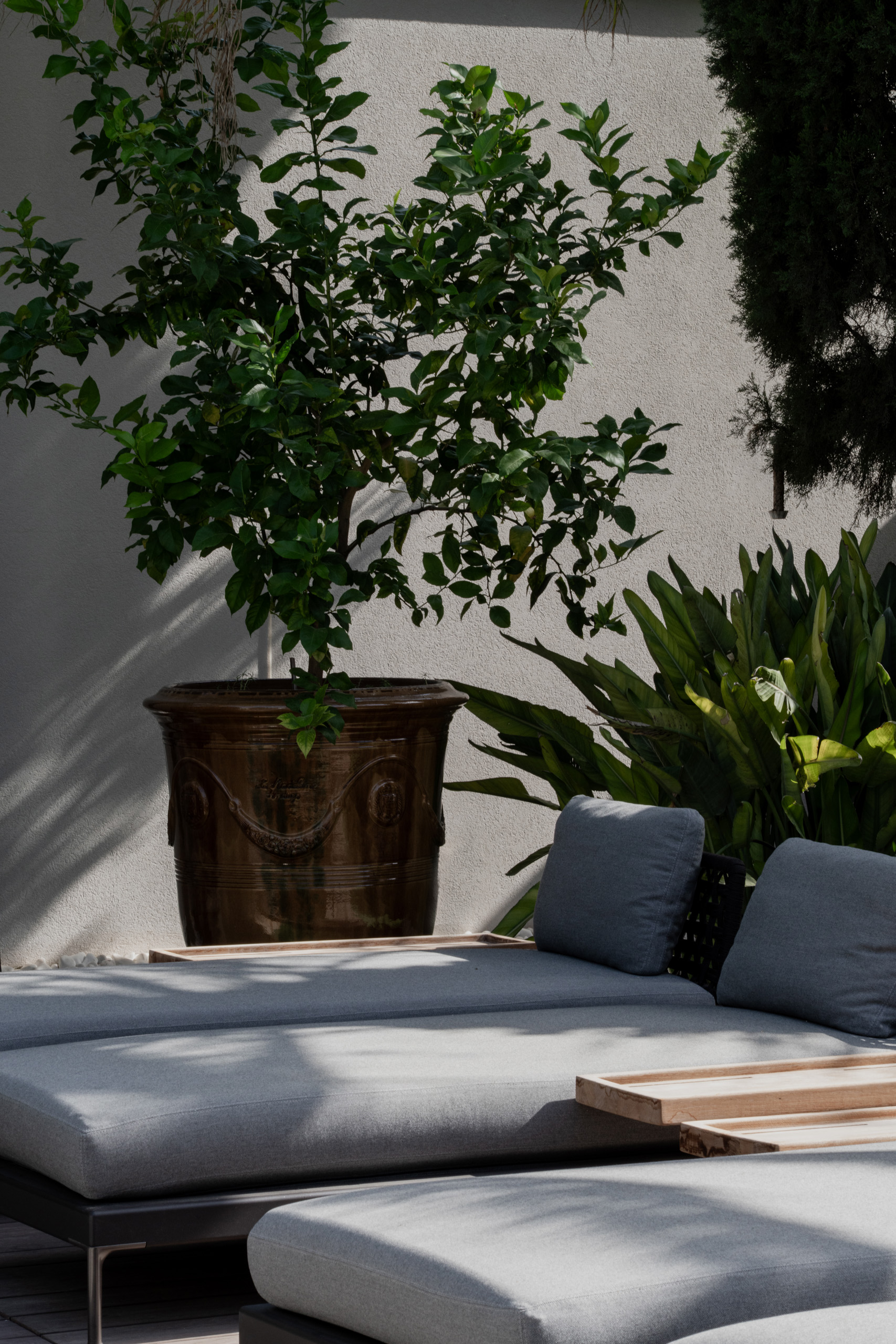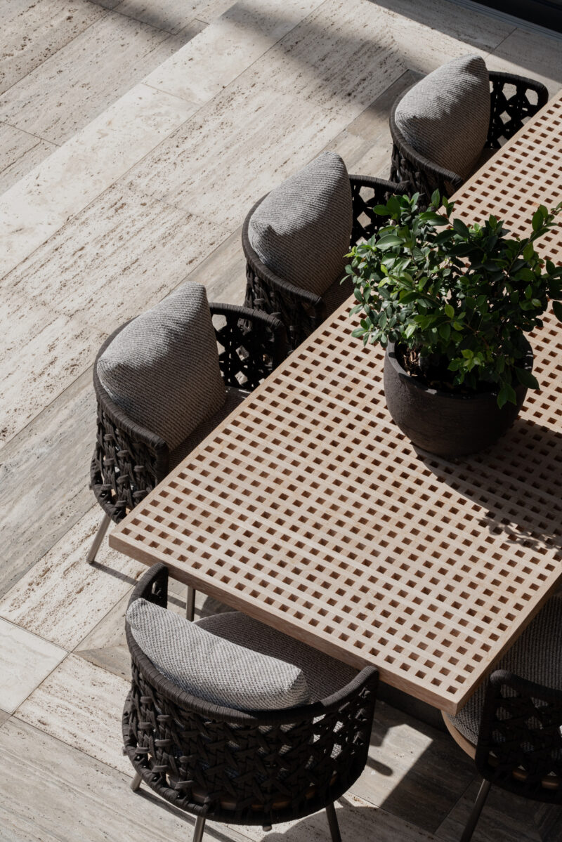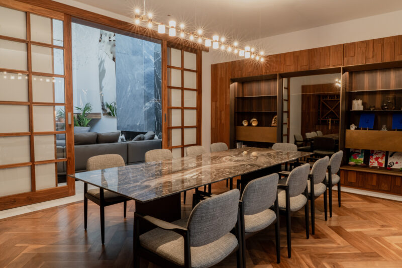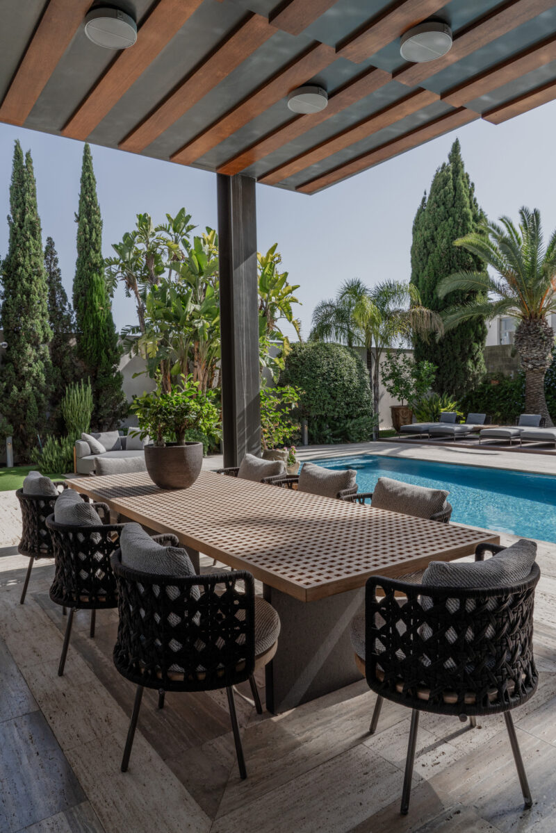 The entrance space and the look achieved with the gorgeous Minotti leather sofas and marble tables partnered with Kane Cali’s pieces hanging on the sides of the majestic marble fireplace. The outdoor area is also one of a kind with three separate areas that may be enjoyed with family and friends: Dining area, sun louging area, and sofa area with a metal firepit in a corten finish.