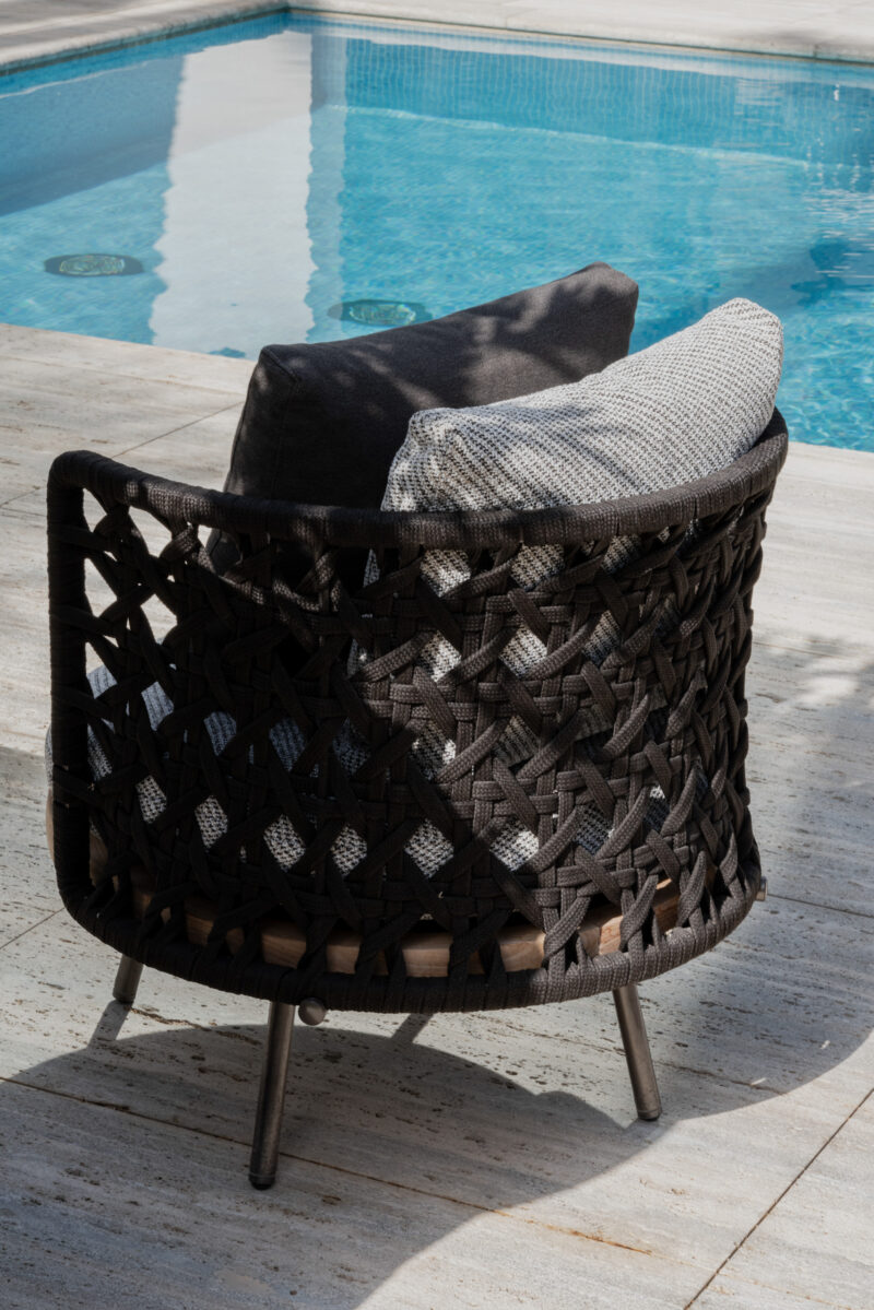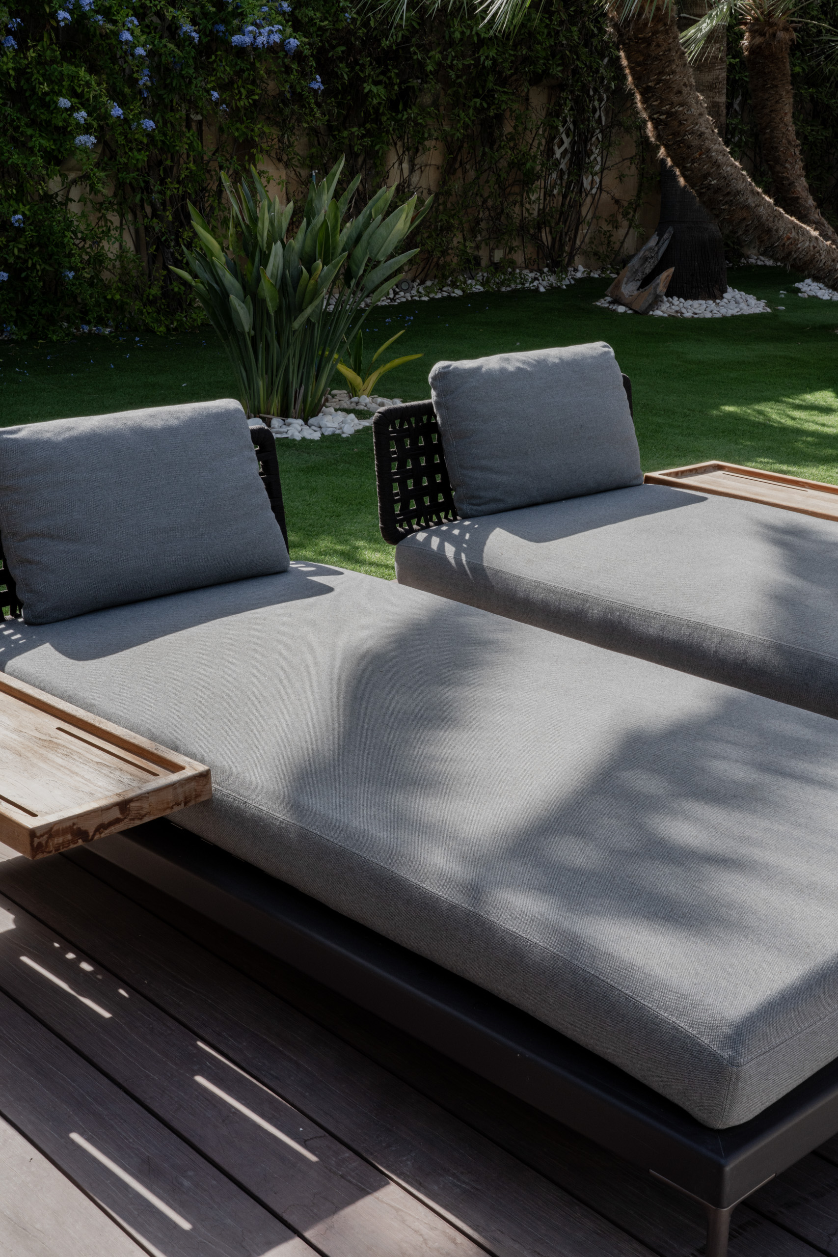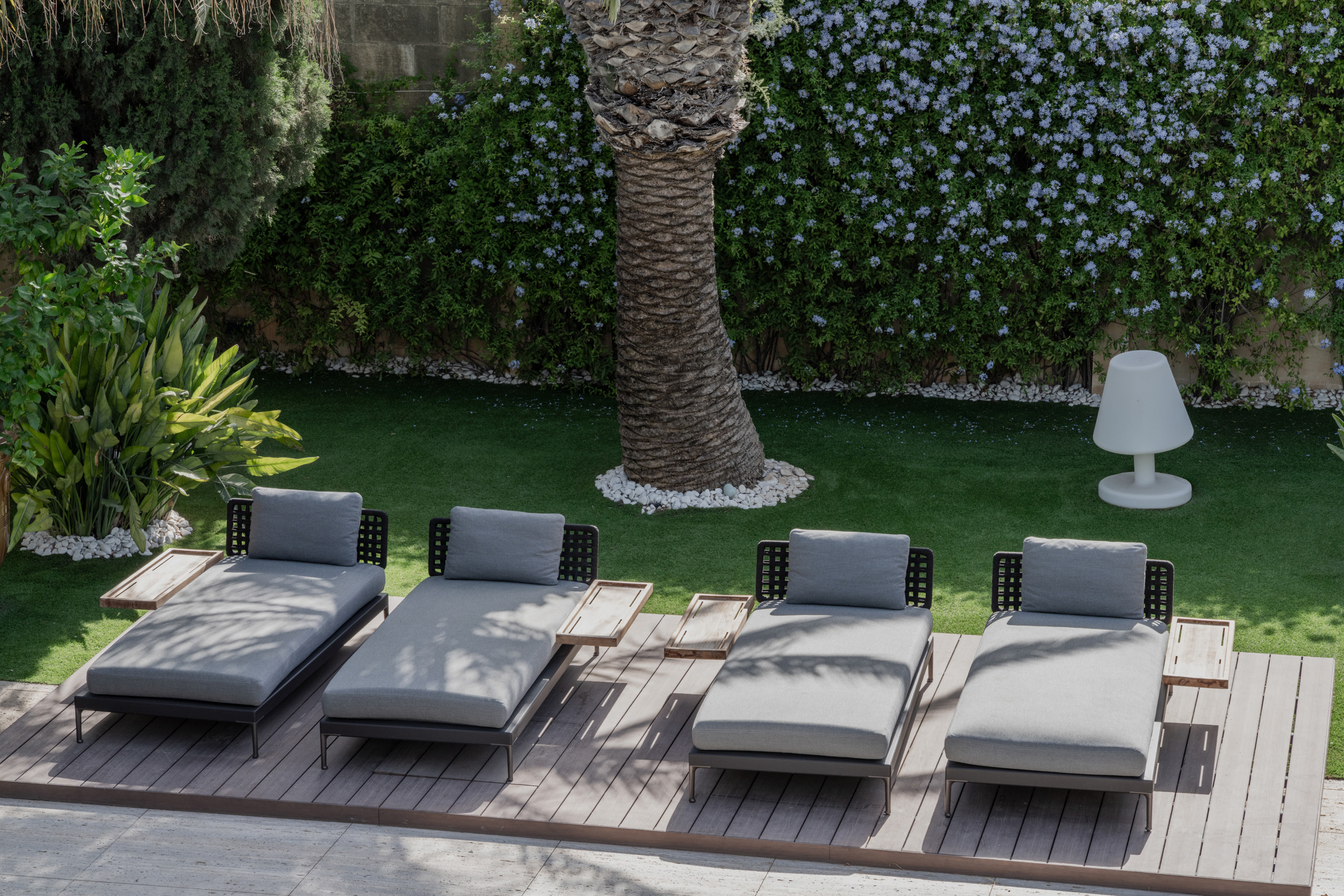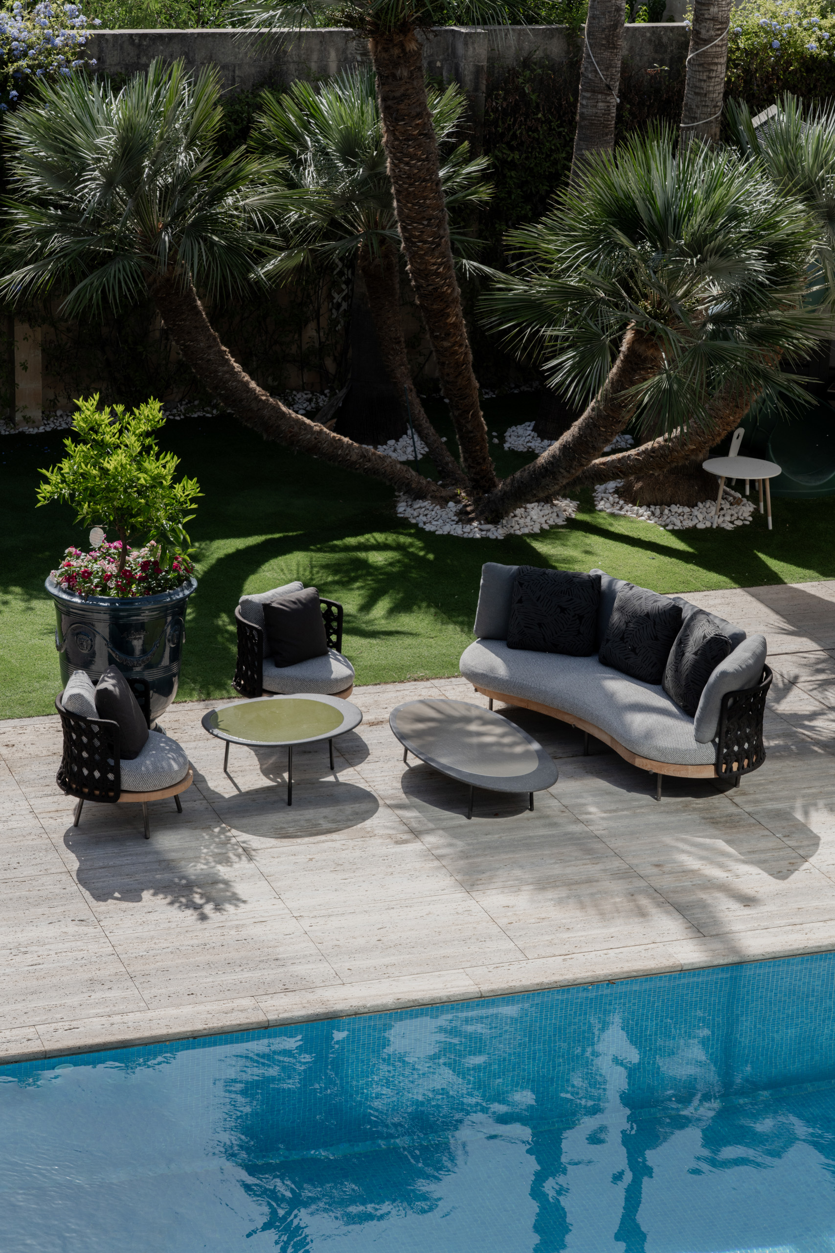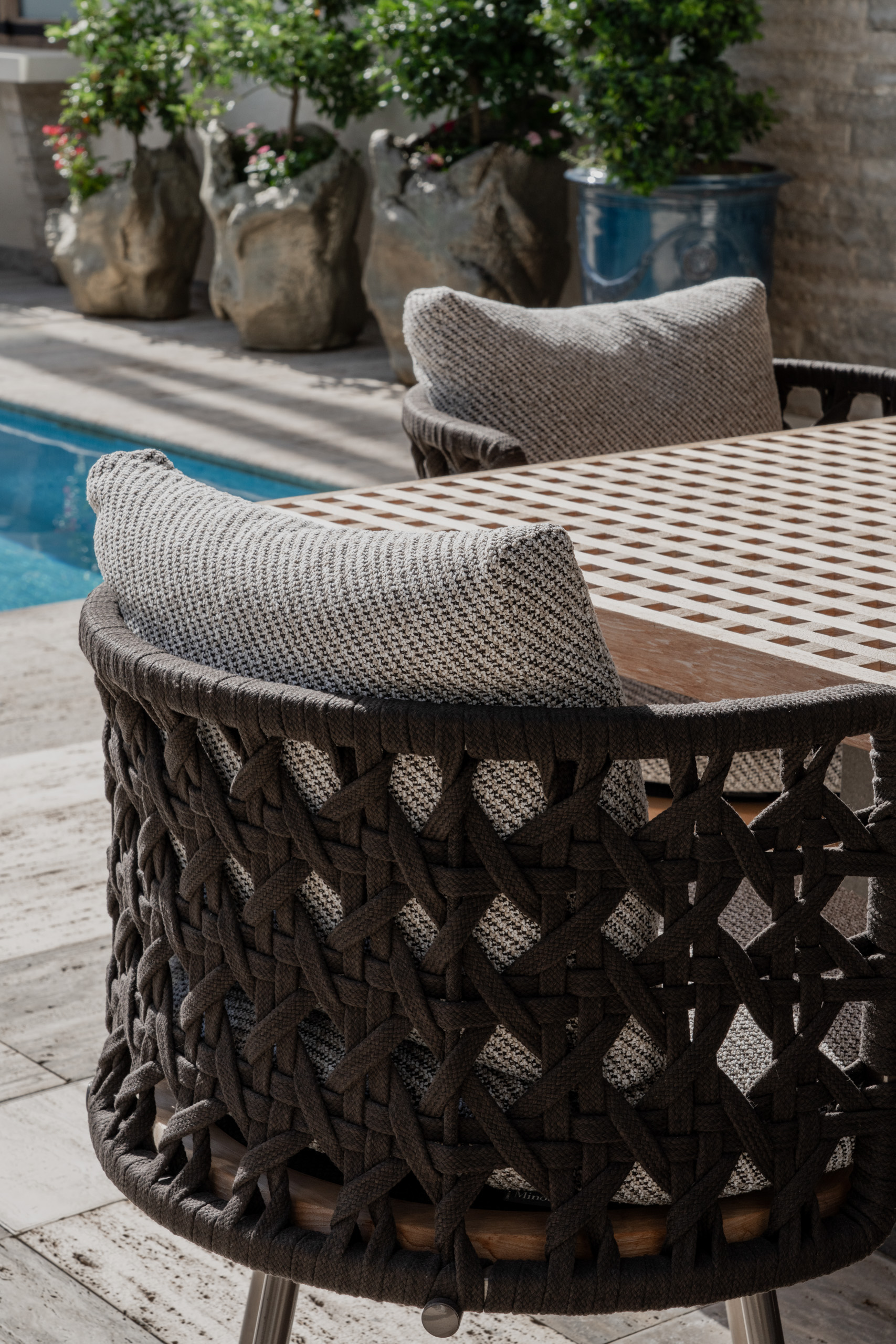 The entrance space and the look achieved with the gorgeous Minotti leather sofas and marble tables partnered with Kane Cali’s pieces hanging on the sides of the majestic marble fireplace. The outdoor area is also one of a kind with three separate areas that may be enjoyed with family and friends: Dining area, sun louging area, and sofa area with a metal firepit in a corten finish.