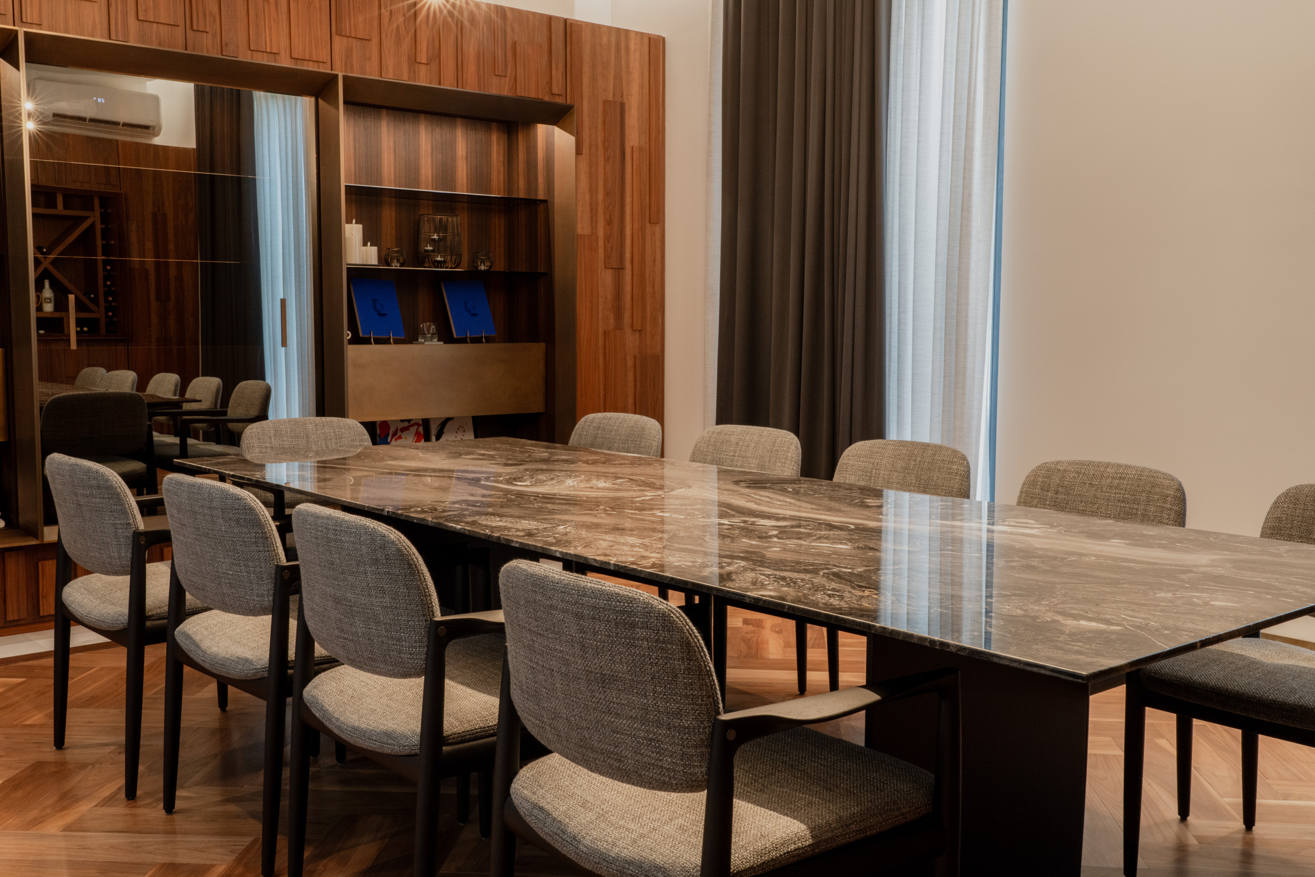 The same style and brand was adopted throughout even though the rooms serve various purposes and functions. A transition from one marble floor to the other was done seamlessly from carrara marble floor to a grey stone in the living quarters.